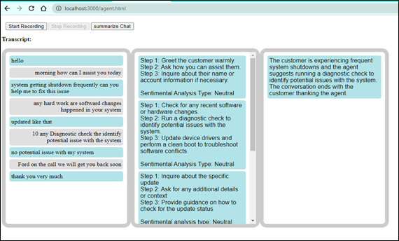 The server-side code (app.js) gets the transcribed message from the agent and transmits it to the customer.html page through Socket.IO. Similarly, the server receives the AI-generated instructive answer based on the customer’s message and sentiment analysis. Socket.IO is used to send the instructive answer to the agent.html page. Because messages and answers are created in real time, both the customer and the agent may receive and view them.