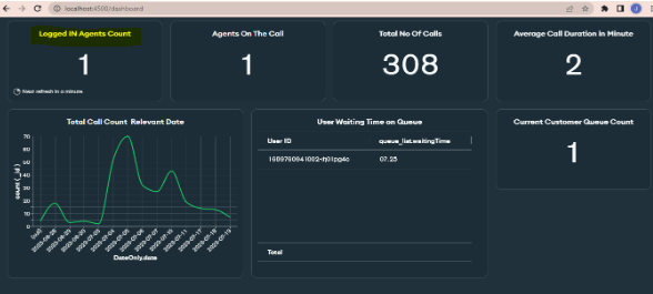 The dashboard page is designed using MongoDB Visualization, employing aggregation to format data and visualize it through charts. The page provides insights into caller queue lists, available agents, average wait times, logged-in agents, agents on calls, and users waiting in the queue.